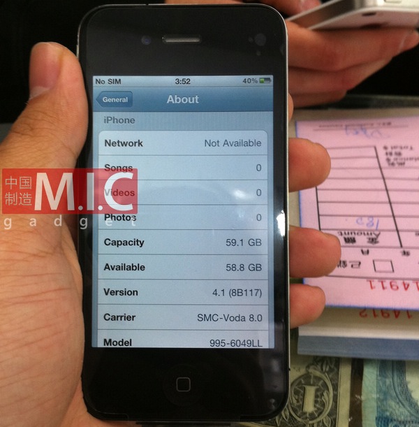 Blog M.I.C. Gadget has acquired an interesting treasure from China, a 64GB iteration of Apple's iPhone. Rumors of the existence of a high-capacity iPhone have been circulating the web for the last few days, but this is the first time we've been treated to crystal clear images and video of the handset. The device, for the most part, looks identical to the current iPhone 4, but bears its closest resemblance to the lost iPhone purchased by Gizmodo last year. The 64GB iPhone, which is being described as an "engineering prototype," lacks the plus and minus engravings on the volume keys, the silver ring which goes around the camera lens is also absent — both emissions on Gizmodo's model. The device has a model number 995-6049LL, is running iOS 4.1, and is not SIM-locked. The faux model number and FCC ID engraved on the back of M.I.C.'s device also match those found on the Giz model. The device certainly does seem to be authentic, and if so, our only question is whether this is what we should expect to see announced this spring or if this is an pre-iPhone 4 release prototype. We're hoping for the latter. Hit the jump to check out the video and a few extra images.