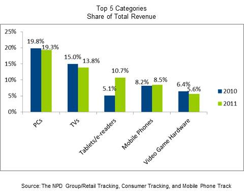 Nearly 60 percent of all sales in 2011 were driven by the top five categories; PCs, TVs, tablets/e-readers, mobile phones, and video game hardware, according to NPD's Retail and Consumer tracking services and Mobile Phone Track. PCs (notebooks and desktops) generated the most revenue with nearly $28 billion in sales, accounting for almost 20 percent of sales, but that figure was a decline of 3 percent from 2010. Tablets/e-readers were the clear winner in 2011, nearly doubling sales to $15 billion in 2011.